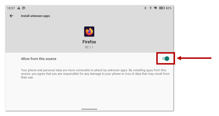 Enable the option to allow installation from this source for Firefox app. This will allow the Firefox app to install Android apps using APK files.