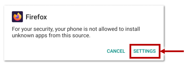 If you see a “For your security, your phone is not allowed to install unknown apps from this source’ message, tap the Settings button. This is because