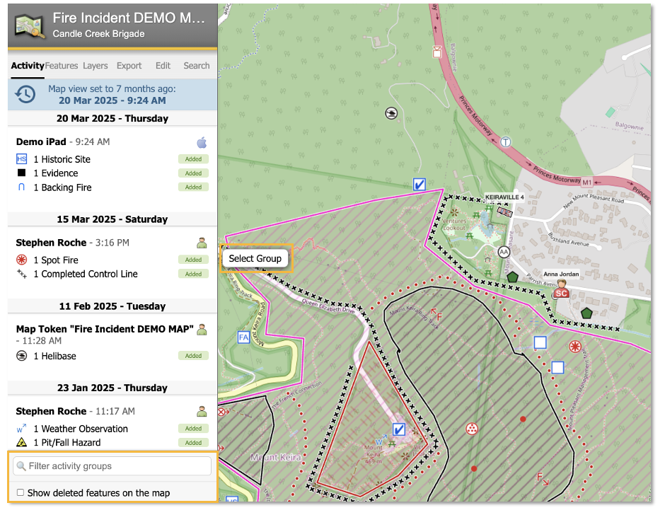 Scrolling through the activity feed will activate FireMapper Timeline mode on the map. This