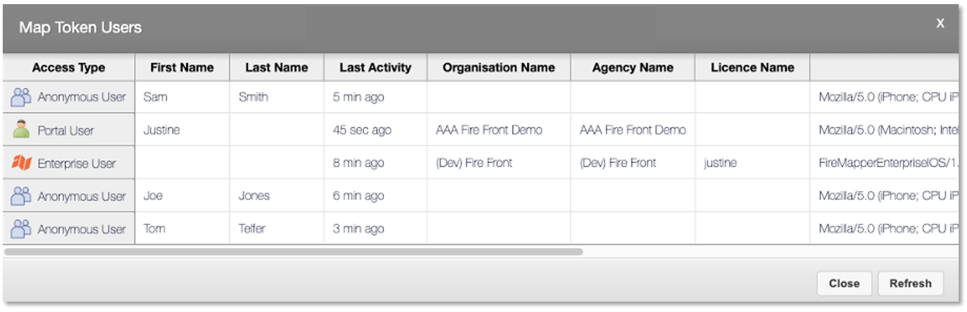 as well as the platform they used to access the Map Token (e.g., FireMapper mobile apps, web, ArcGIS) is thus visible in the portal.