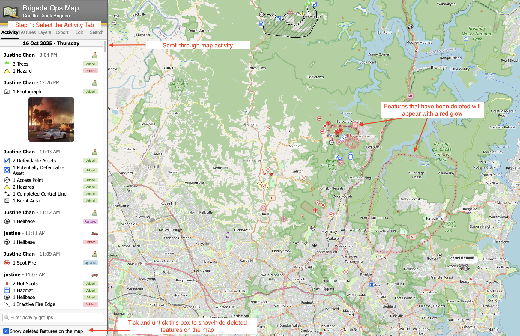 The Activity Tab provides a chronological feed of additions and changes to features on the map. By